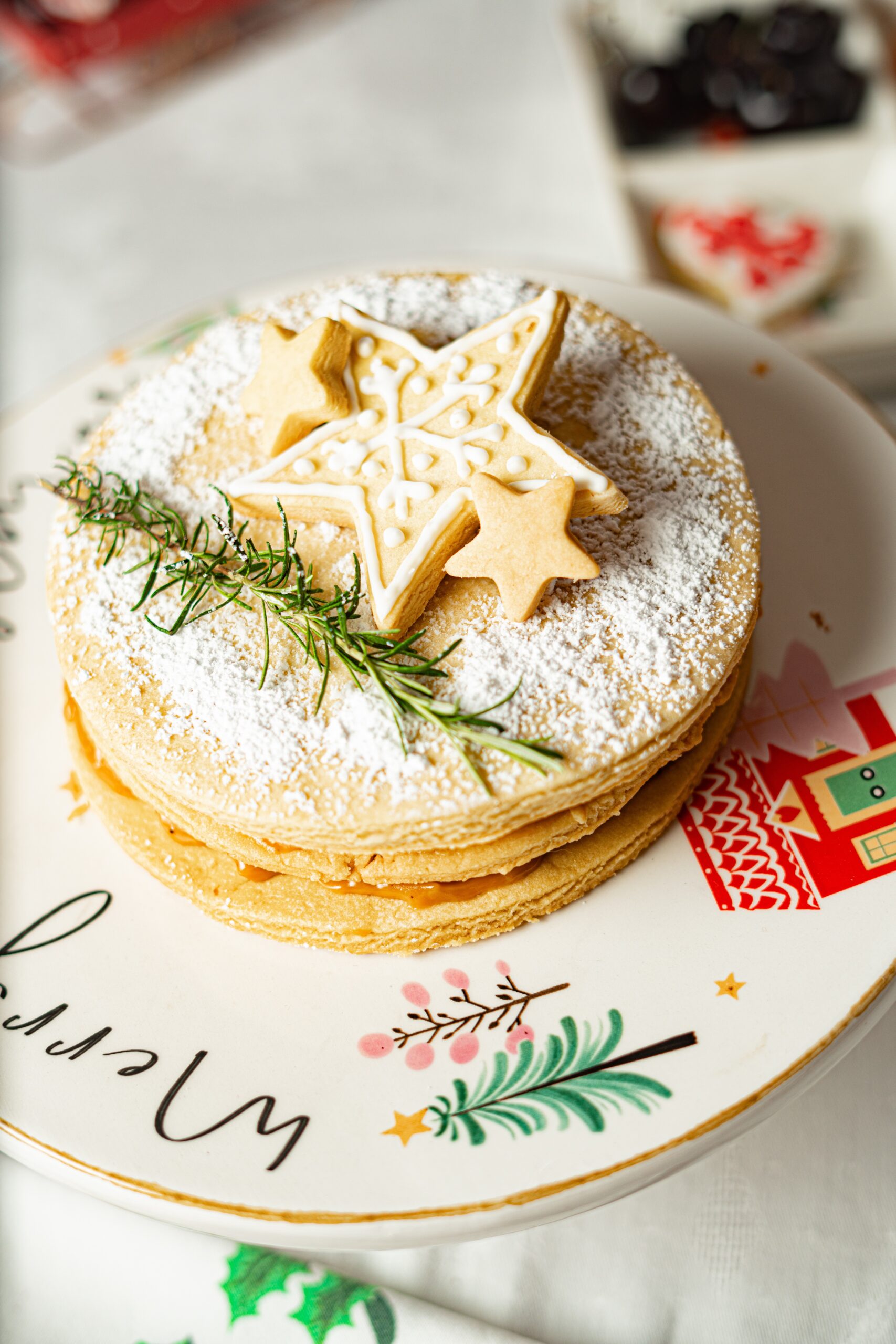 Alfajor clásico relleno de Manjar blanco de olla. Espolvoreado con azúcar fina y hojas de romero. El buen sabor de siempre.