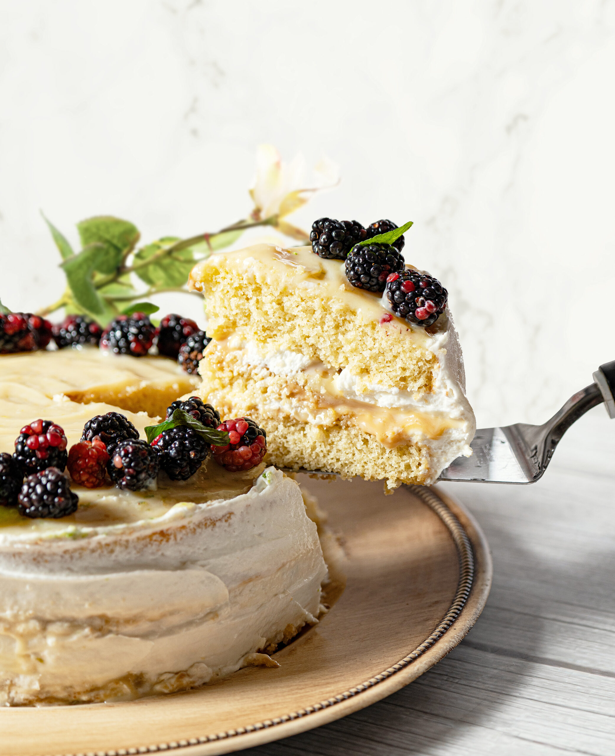 Bizcocho húmedo de Vainilla, relleno de curd de limón y crema batida. Cubierta con zarzamoras y hojas de menta de cultivo artesanal.